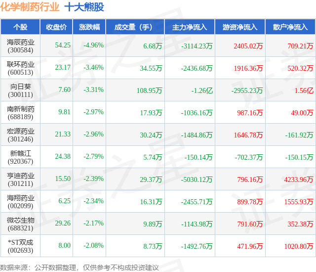 个股表现方面,化学制药行业当日领跌股为海辰药业(300584),该股当日报收54.25,下跌4.96%,成交量6.68万,主力资金净流出3114.23万元。联环药业(600513)以下跌3.46%紧随其后,该股当日成交量34.55万,主力资金净流出2436.68万元。除此之外,向日葵(300111)、南新制药(688189)、宏源药业(301246)均进入当日熊股之列。具体个股列表见下表: