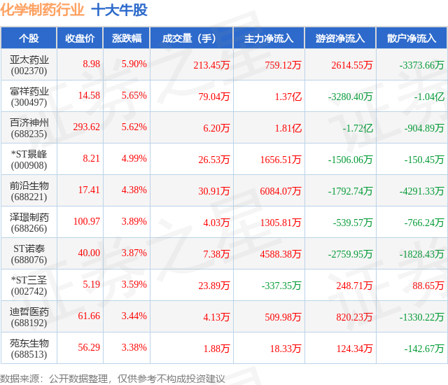 个股表现方面,化学制药行业当日领涨股为亚太药业(002370),该股当日报收8.98,上涨5.9%,成交量213.45万,主力资金净流入759.12万元。富祥药业(300497)以上涨5.65%紧随其后,该股当日成交量79.04万,主力资金净流入1.37亿元。除此之外,百济神州(688235)、*ST景峰(000908)、前沿生物(688221)均进入当日牛股之列。具体个股列表见下表: