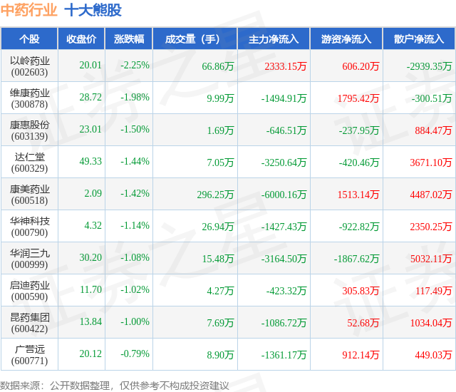 个股表现方面,中药行业当日领跌股为以岭药业(002603),该股当日报收20.01,下跌2.25%,成交量66.86万,主力资金净流入2333.15万元。维康药业(300878)以下跌1.98%紧随其后,该股当日成交量9.99万,主力资金净流出1494.91万元。除此之外,康惠股份(603139)、达仁堂(600329)、康美药业(600518)均进入当日熊股之列。具体个股列表见下表: