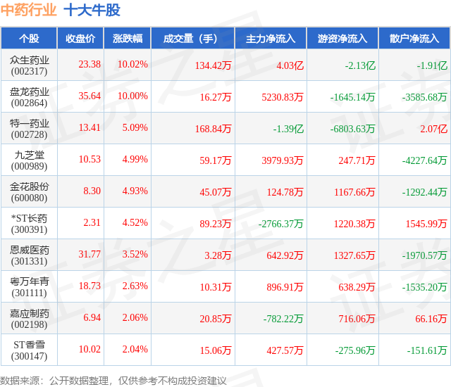 个股表现方面,中药行业当日领涨股为众生药业(002317),该股当日报收23.38,上涨10.02%,成交量134.42万,主力资金净流入4.03亿元。盘龙药业(002864)以上涨10.0%紧随其后,该股当日成交量16.27万,主力资金净流入5230.83万元。除此之外,特一药业(002728)、九芝堂(000989)、金花股份(600080)均进入当日牛股之列。具体个股列表见下表: