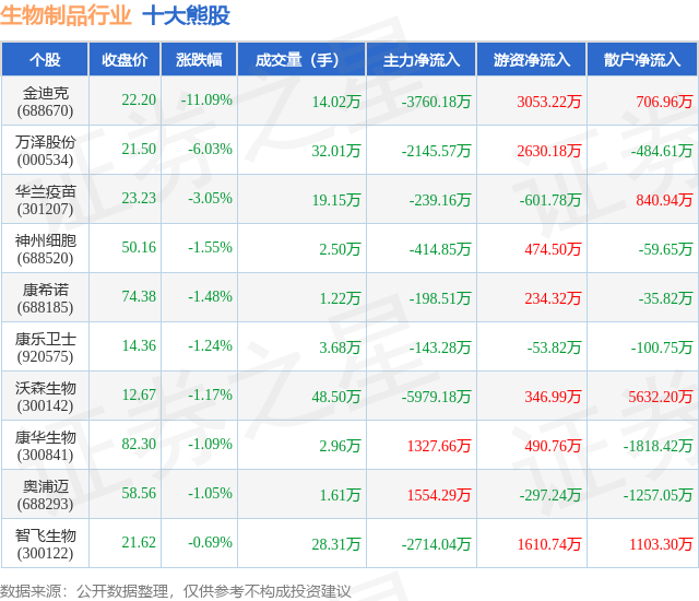 个股表现方面,生物制品行业当日领跌股为金迪克(688670),该股当日报收22.2,下跌11.09%,成交量14.02万,主力资金净流出3760.18万元。万泽股份(000534)以下跌6.03%紧随其后,该股当日成交量32.01万,主力资金净流出2145.57万元。除此之外,华兰疫苗(301207)、神州细胞(688520)、康希诺(688185)均进入当日熊股之列。具体个股列表见下表: