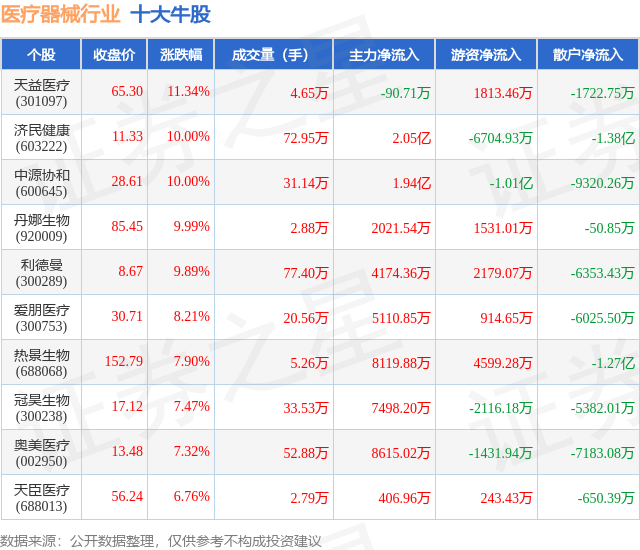 个股表现方面,医疗器械行业当日领涨股为天益医疗(301097),该股当日报收65.3,上涨11.34%,成交量4.65万,主力资金净流出90.71万元。济民健康(603222)以上涨10.0%紧随其后,该股当日成交量72.95万,主力资金净流入2.05亿元。除此之外,中源协和(600645)、丹娜生物(920009)、利德曼(300289)均进入当日牛股之列。具体个股列表见下表: