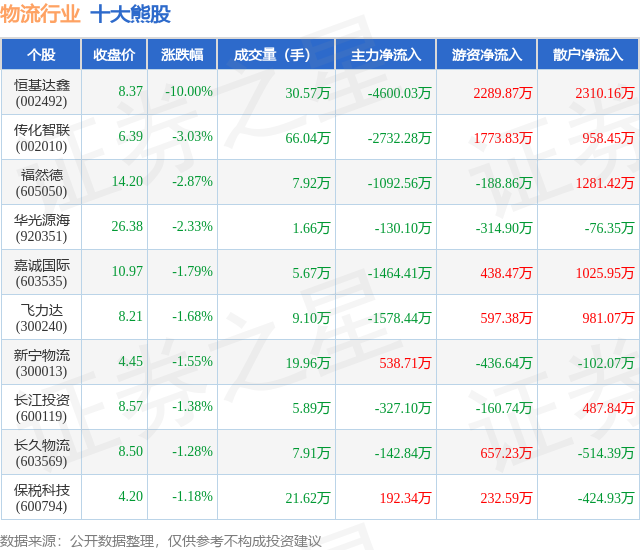 个股表现方面,物流行业当日领跌股为恒基达鑫(002492),该股当日报收8.37,下跌10.0%,成交量30.57万,主力资金净流出4600.03万元。传化智联(002010)以下跌3.03%紧随其后,该股当日成交量66.04万,主力资金净流出2732.28万元。除此之外,福然德(605050)、华光源海(920351)、嘉诚国际(603535)均进入当日熊股之列。具体个股列表见下表: