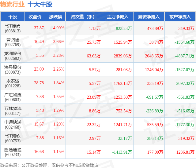 个股表现方面,物流行业当日领涨股为*ST原尚(603813),该股当日报收37.87,上涨4.99%,成交量1.13万,主力资金净流出823.23万元。普路通(002769)以上涨3.66%紧随其后,该股当日成交量25.73万,主力资金净流入1525.94万元。除此之外,龙洲股份(002682)、海晨股份(300873)、永泰运(001228)均进入当日牛股之列。具体个股列表见下表: