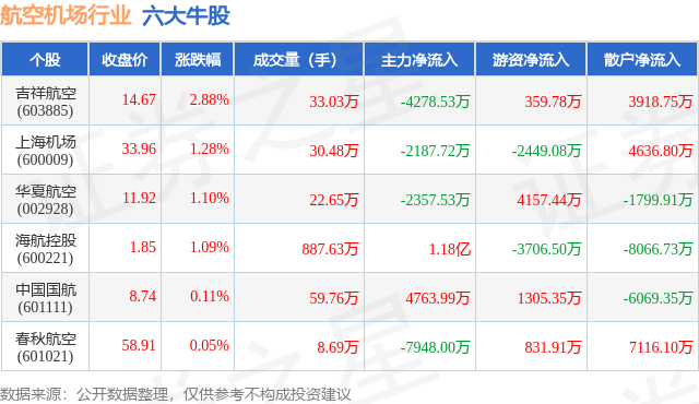 个股表现方面,航空机场行业当日领涨股为吉祥航空(603885),该股当日报收14.67,上涨2.88%,成交量33.03万,主力资金净流出4278.53万元。上海机场(600009)以上涨1.28%紧随其后,该股当日成交量30.48万,主力资金净流出2187.72万元。除此之外,华夏航空(002928)、海航控股(600221)、中国国航(601111)均进入当日牛股之列。具体个股列表见下表: