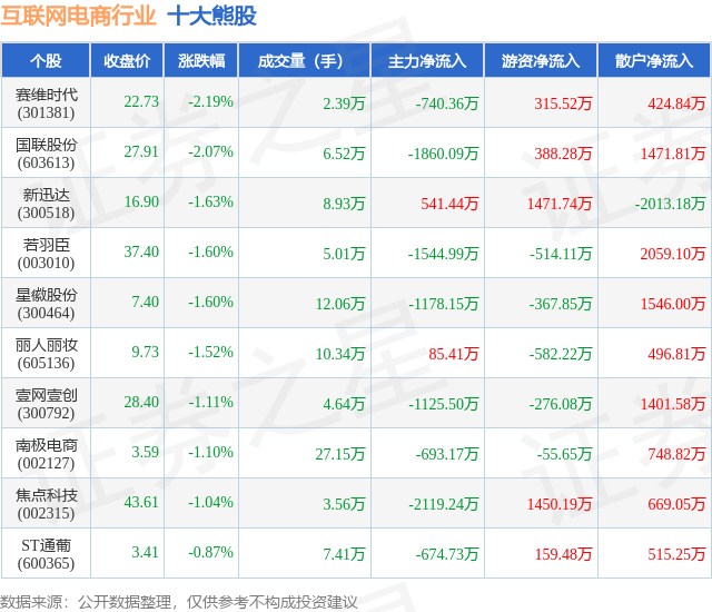 个股表现方面,互联网电商行业当日领跌股为赛维时代(301381),该股当日报收22.73,下跌2.19%,成交量2.39万,主力资金净流出740.36万元。国联股份(603613)以下跌2.07%紧随其后,该股当日成交量6.52万,主力资金净流出1860.09万元。除此之外,新迅达(300518)、若羽臣(003010)、星徽股份(300464)均进入当日熊股之列。具体个股列表见下表: