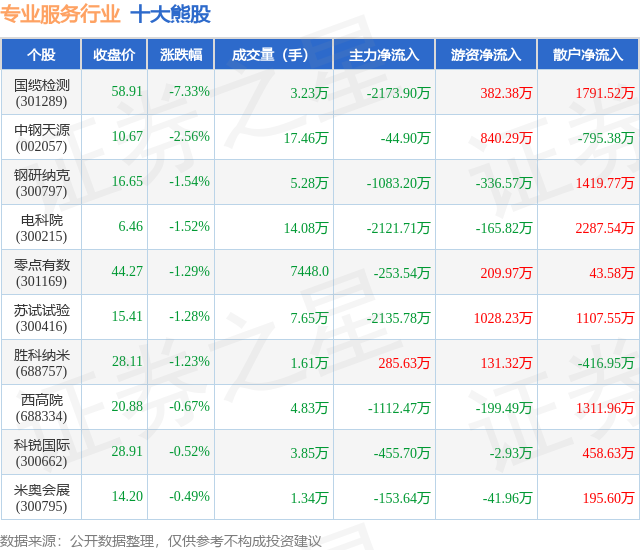个股表现方面,专业服务行业当日领跌股为国缆检测(301289),该股当日报收58.91,下跌7.33%,成交量3.23万,主力资金净流出2173.9万元。中钢天源(002057)以下跌2.56%紧随其后,该股当日成交量17.46万,主力资金净流出44.9万元。除此之外,钢研纳克(300797)、电科院(300215)、零点有数(301169)均进入当日熊股之列。具体个股列表见下表: