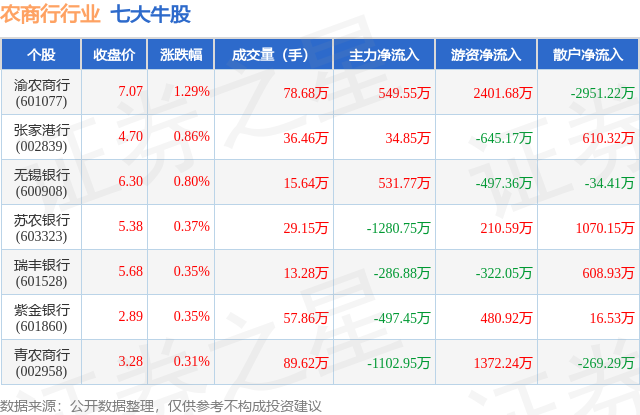 个股表现方面,农商行行业当日领涨股为渝农商行(601077),该股当日报收7.07,上涨1.29%,成交量78.68万,主力资金净流入549.55万元。张家港行(002839)以上涨0.86%紧随其后,该股当日成交量36.46万,主力资金净流入34.85万元。除此之外,无锡银行(600908)、苏农银行(603323)、瑞丰银行(601528)均进入当日牛股之列。具体个股列表见下表: