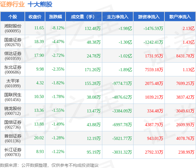 个股表现方面,证券行业当日领跌股为湘财股份(600095),该股当日报收11.65,下跌8.12%,成交量132.48万,主力资金净流出1.98亿元。国盛证券(002670)以下跌4.47%紧随其后,该股当日成交量48.38万,主力资金净流出1.3亿元。除此之外,信达证券(601059)、东北证券(000686)、太平洋(601099)均进入当日熊股之列。具体个股列表见下表: