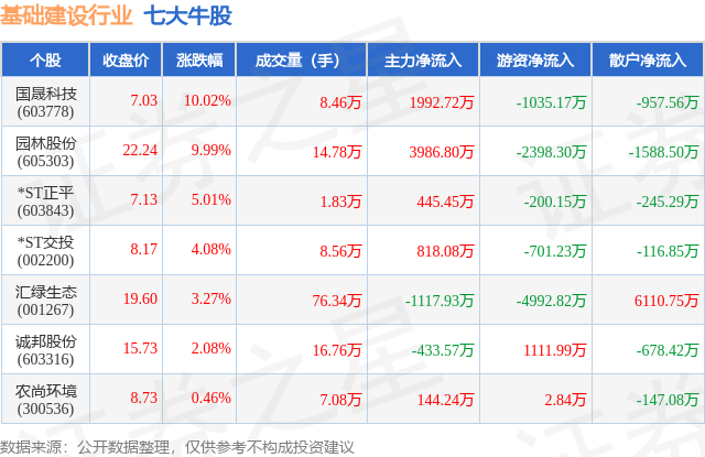 个股表现方面,基础建设行业当日领涨股为国晟科技(603778),该股当日报收7.03,上涨10.02%,成交量8.46万,主力资金净流入1992.72万元。园林股份(605303)以上涨9.99%紧随其后,该股当日成交量14.78万,主力资金净流入3986.8万元。除此之外,*ST正平(603843)、*ST交投(002200)、汇绿生态(001267)均进入当日牛股之列。具体个股列表见下表: