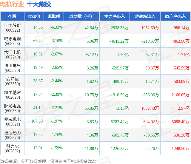 个股表现方面,电机行业当日领跌股为佳电股份(000922),该股当日报收14.36,下跌6.33%,成交量42.64万,主力资金净流出2938.73万元。鸣志电器(603728)以下跌3.1%紧随其后,该股当日成交量5.06万,主力资金净流出4645.22万元。除此之外,大洋电机(002249)、迪贝电气(603320)、安乃达(603350)均进入当日熊股之列。具体个股列表见下表: