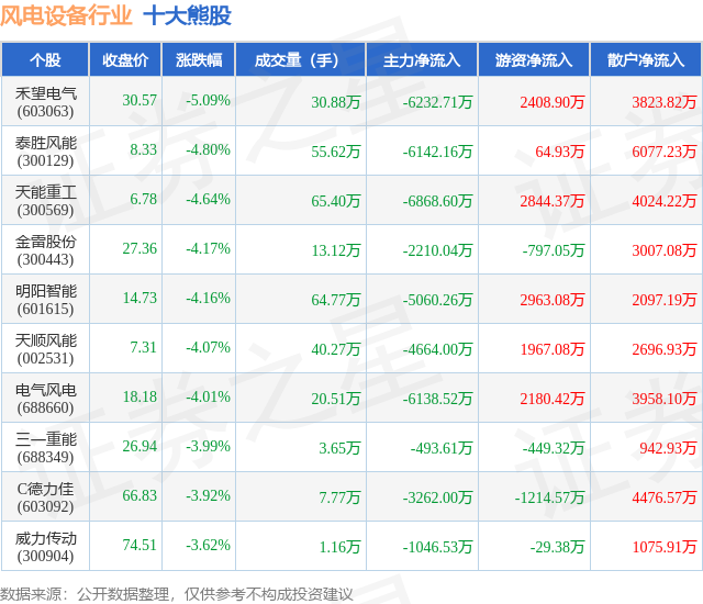 个股表现方面,风电设备行业当日领跌股为禾望电气(603063),该股当日报收30.57,下跌5.09%,成交量30.88万,主力资金净流出6232.71万元。泰胜风能(300129)以下跌4.8%紧随其后,该股当日成交量55.62万,主力资金净流出6142.16万元。除此之外,天能重工(300569)、金雷股份(300443)、明阳智能(601615)均进入当日熊股之列。具体个股列表见下表:
