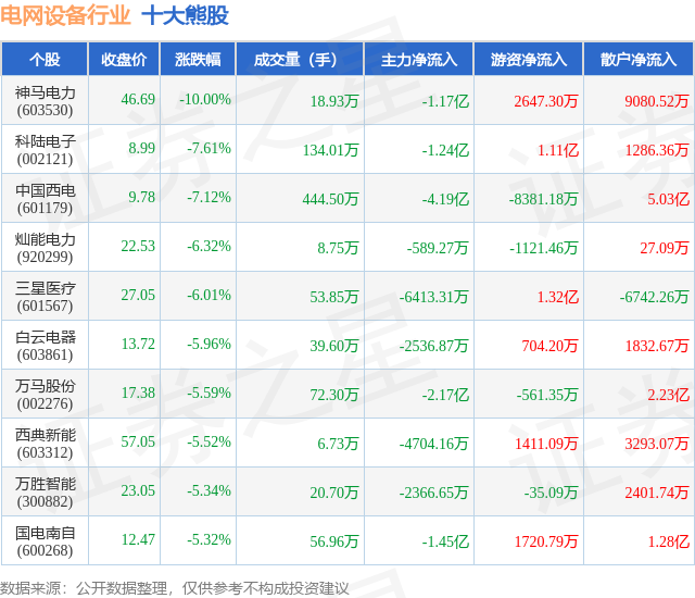个股表现方面,电网设备行业当日领跌股为神马电力(603530),该股当日报收46.69,下跌10.0%,成交量18.93万,主力资金净流出1.17亿元。科陆电子(002121)以下跌7.61%紧随其后,该股当日成交量134.01万,主力资金净流出1.24亿元。除此之外,中国西电(601179)、灿能电力(920299)、三星医疗(601567)均进入当日熊股之列。具体个股列表见下表: