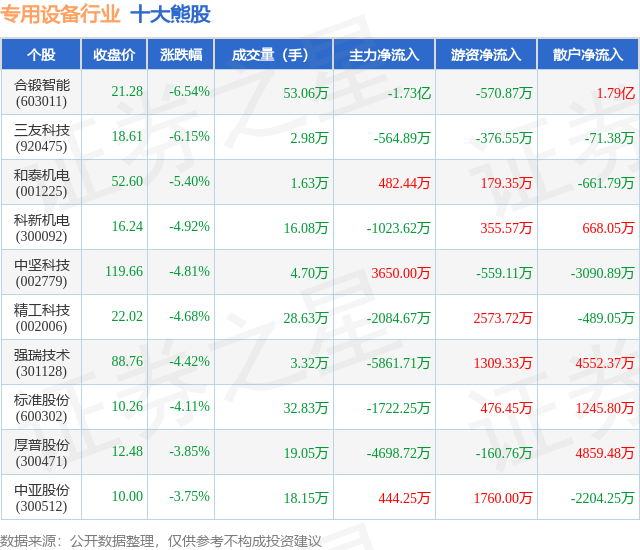 个股表现方面,专用设备行业当日领跌股为合锻智能(603011),该股当日报收21.28,下跌6.54%,成交量53.06万,主力资金净流出1.73亿元。三友科技(920475)以下跌6.15%紧随其后,该股当日成交量2.98万,主力资金净流出564.89万元。除此之外,和泰机电(001225)、科新机电(300092)、中坚科技(002779)均进入当日熊股之列。具体个股列表见下表: