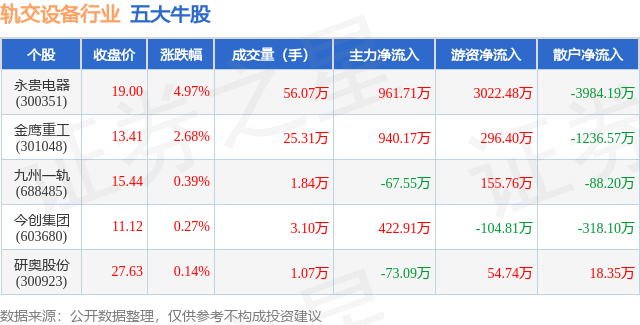 个股表现方面,轨交设备行业当日领涨股为永贵电器(300351),该股当日报收19.0,上涨4.97%,成交量56.07万,主力资金净流入961.71万元。金鹰重工(301048)以上涨2.68%紧随其后,该股当日成交量25.31万,主力资金净流入940.17万元。除此之外,九州一轨(688485)、今创集团(603680)、研奥股份(300923)均进入当日牛股之列。具体个股列表见下表: