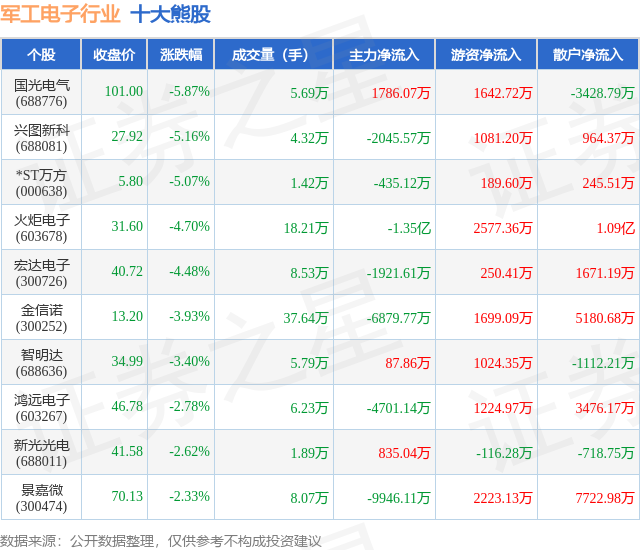 个股表现方面,军工电子行业当日领跌股为国光电气(688776),该股当日报收101.0,下跌5.87%,成交量5.69万,主力资金净流入1786.07万元。兴图新科(688081)以下跌5.16%紧随其后,该股当日成交量4.32万,主力资金净流出2045.57万元。除此之外,*ST万方(000638)、火炬电子(603678)、宏达电子(300726)均进入当日熊股之列。具体个股列表见下表: