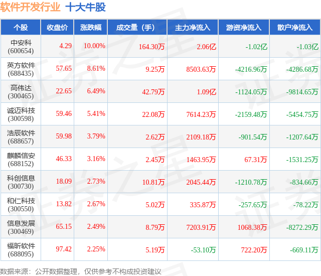 个股表现方面,软件开发行业当日领涨股为中安科(600654),该股当日报收4.29,上涨10.0%,成交量164.3万,主力资金净流入2.06亿元。英方软件(688435)以上涨8.61%紧随其后,该股当日成交量9.25万,主力资金净流入8503.63万元。除此之外,高伟达(300465)、诚迈科技(300598)、浩辰软件(688657)均进入当日牛股之列。具体个股列表见下表: