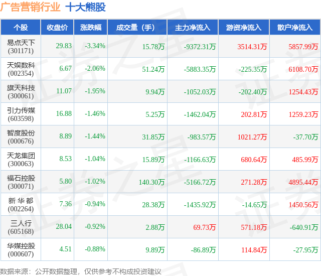 个股表现方面,广告营销行业当日领跌股为易点天下(301171),该股当日报收29.83,下跌3.34%,成交量15.78万,主力资金净流出9372.31万元。天娱数科(002354)以下跌2.06%紧随其后,该股当日成交量51.24万,主力资金净流出5883.35万元。除此之外,旗天科技(300061)、引力传媒(603598)、智度股份(000676)均进入当日熊股之列。具体个股列表见下表: