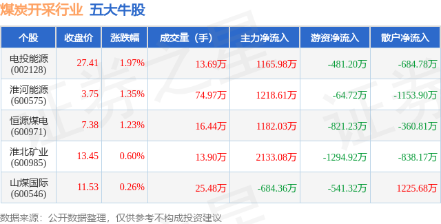 个股表现方面,煤炭开采行业当日领涨股为电投能源(002128),该股当日报收27.41,上涨1.97%,成交量13.69万,主力资金净流入1165.98万元。淮河能源(600575)以上涨1.35%紧随其后,该股当日成交量74.97万,主力资金净流入1218.61万元。除此之外,恒源煤电(600971)、淮北矿业(600985)、山煤国际(600546)均进入当日牛股之列。具体个股列表见下表: