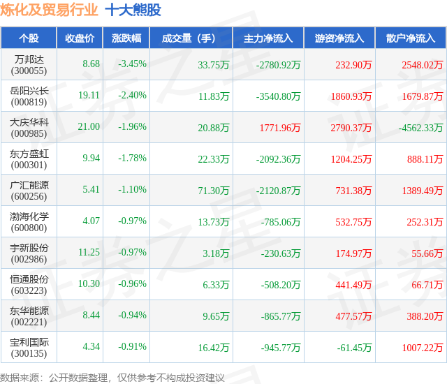 个股表现方面,炼化及贸易行业当日领跌股为万邦达(300055),该股当日报收8.68,下跌3.45%,成交量33.75万,主力资金净流出2780.92万元。岳阳兴长(000819)以下跌2.4%紧随其后,该股当日成交量11.83万,主力资金净流出3540.8万元。除此之外,大庆华科(000985)、东方盛虹(000301)、广汇能源(600256)均进入当日熊股之列。具体个股列表见下表: