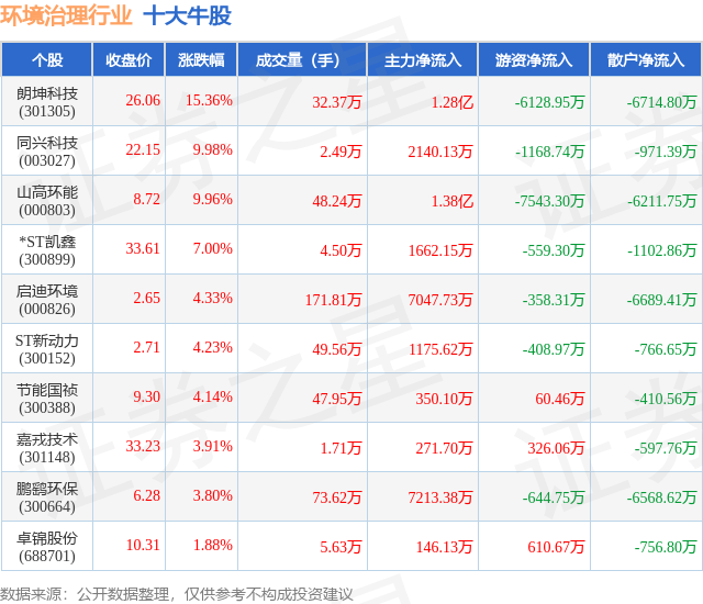 个股表现方面,环境治理行业当日领涨股为朗坤科技(301305),该股当日报收26.06,上涨15.36%,成交量32.37万,主力资金净流入1.28亿元。同兴科技(003027)以上涨9.98%紧随其后,该股当日成交量2.49万,主力资金净流入2140.13万元。除此之外,山高环能(000803)、*ST凯鑫(300899)、启迪环境(000826)均进入当日牛股之列。具体个股列表见下表:
