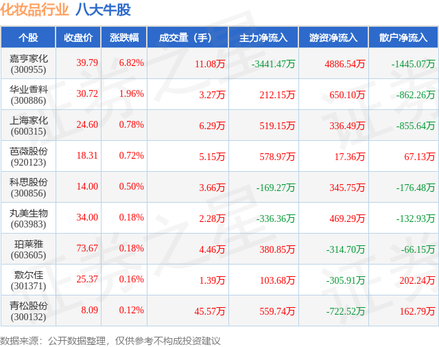 个股表现方面,化妆品行业当日领涨股为嘉亨家化(300955),该股当日报收39.79,上涨6.82%,成交量11.08万,主力资金净流出3441.47万元。华业香料(300886)以上涨1.96%紧随其后,该股当日成交量3.27万,主力资金净流入212.15万元。除此之外,上海家化(600315)、芭薇股份(920123)、科思股份(300856)均进入当日牛股之列。具体个股列表见下表: