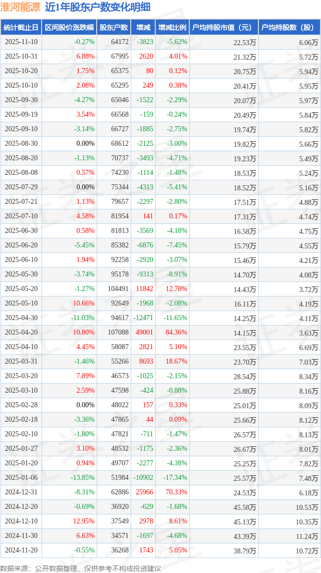 从股价来看,2025年10月31日至2025年11月10日,淮河能源区间跌幅为0.27%,在此期间股东户数减少3823.0户,减幅为5.62%。