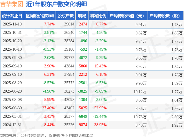 从股价来看,2025年10月31日至2025年11月10日,吉华集团区间涨幅为7.74%,在此期间股东户数增加2474.0户,增幅为6.77%。