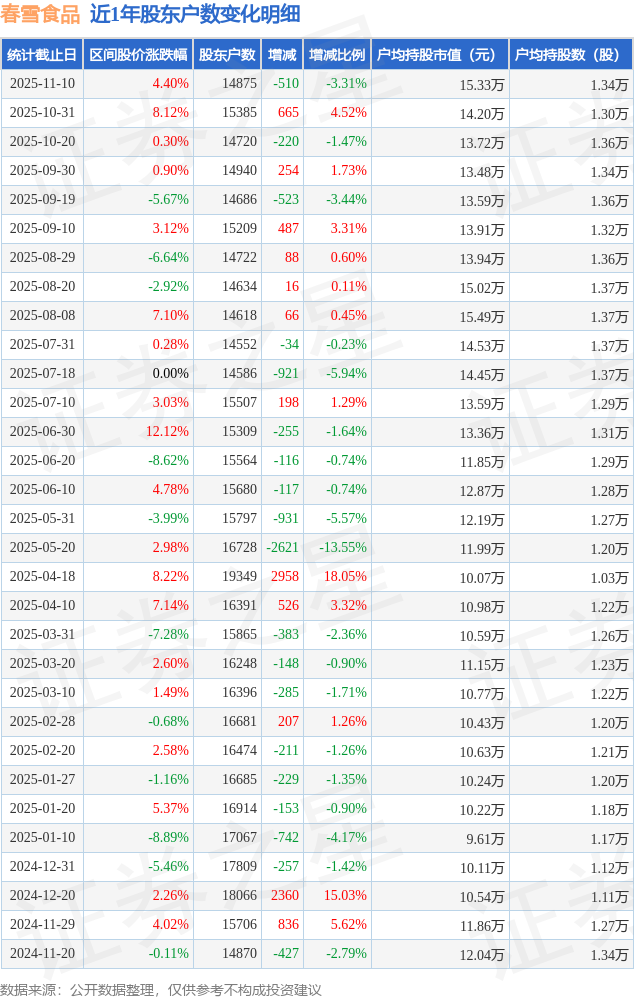 从股价来看,2025年10月31日至2025年11月10日,春雪食品区间涨幅为4.4%,在此期间股东户数减少510.0户,减幅为3.31%。