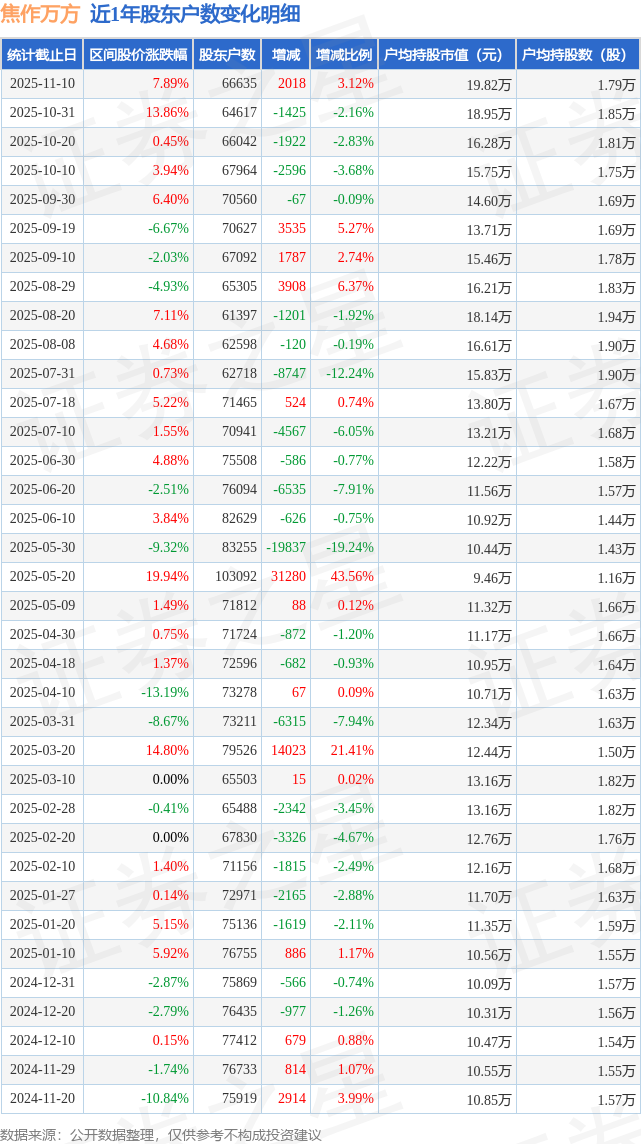 从股价来看,2025年10月31日至2025年11月10日,焦作万方区间涨幅为7.89%,在此期间股东户数增加2018.0户,增幅为3.12%。