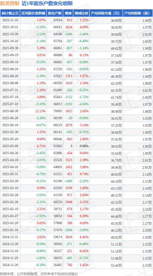从股价来看,2025年10月31日至2025年11月10日,航发控制区间涨幅为1.07%,在此期间股东户数增加812.0户,增幅为1.22%。