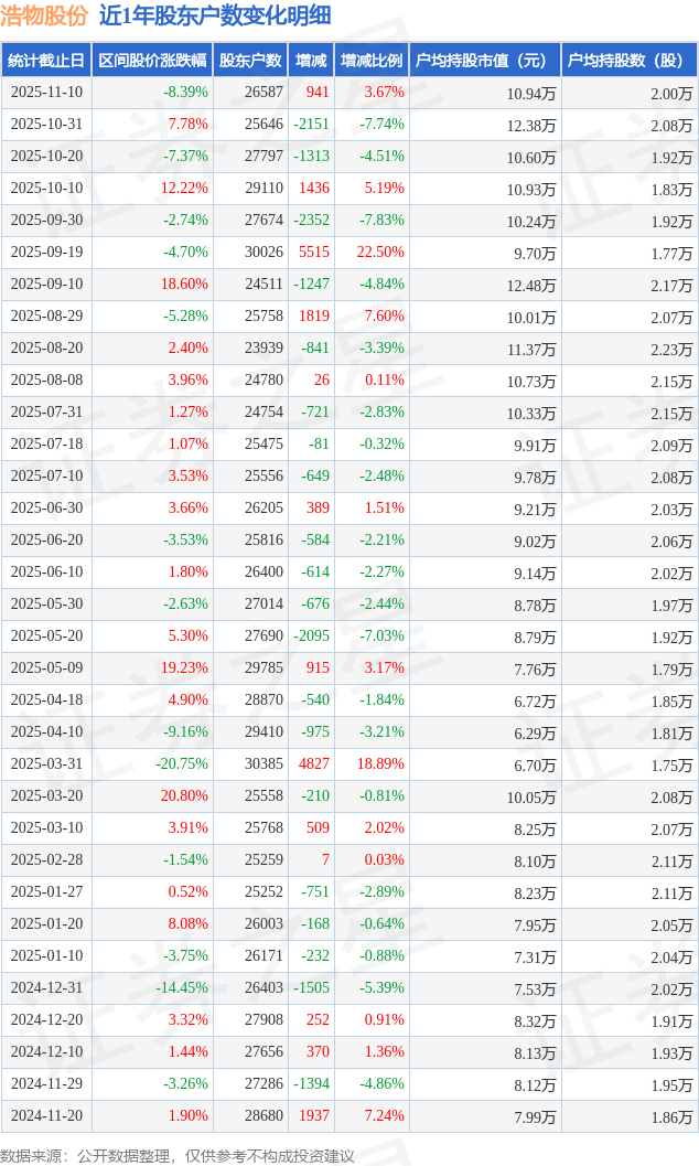 从股价来看,2025年10月31日至2025年11月10日,浩物股份区间跌幅为8.39%,在此期间股东户数增加941.0户,增幅为3.67%。