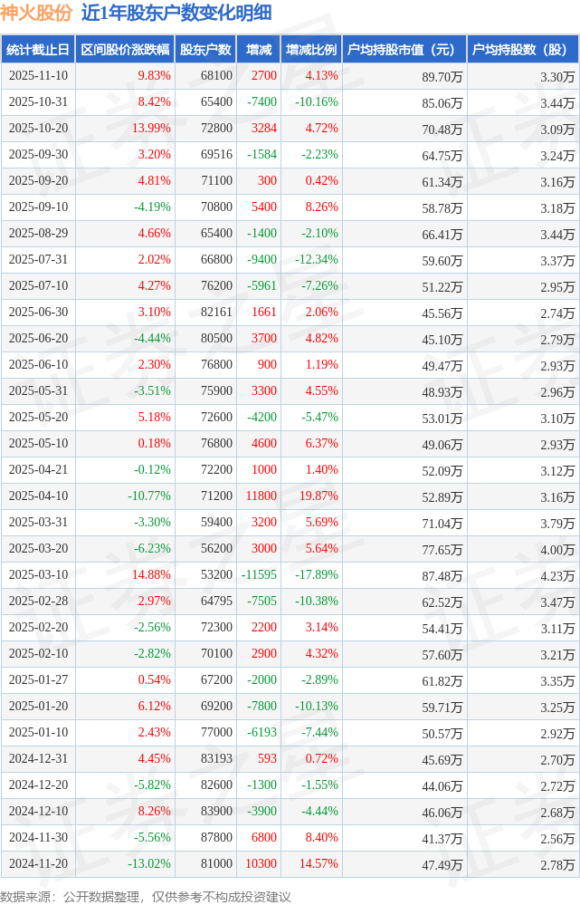 从股价来看,2025年10月31日至2025年11月10日,神火股份区间涨幅为9.83%,在此期间股东户数增加2700.0户,增幅为4.13%。