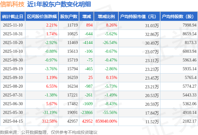 从股价来看,2025年10月31日至2025年11月10日,信凯科技区间涨幅为2.21%,在此期间股东户数增加894.0户,增幅为8.26%。