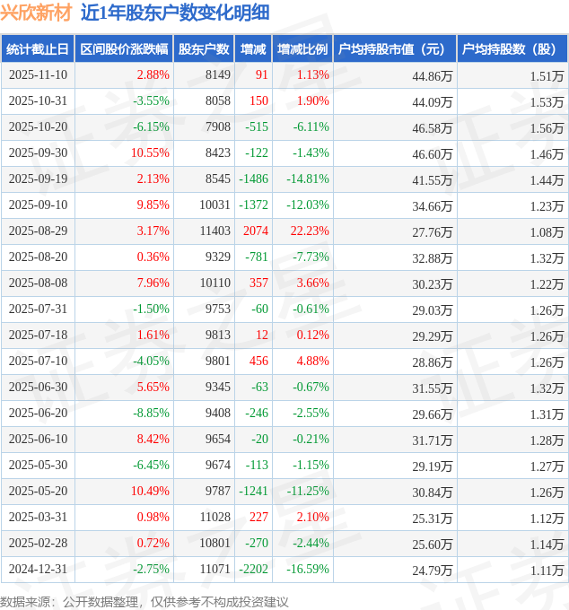 从股价来看,2025年10月31日至2025年11月10日,兴欣新材区间涨幅为2.88%,在此期间股东户数增加91.0户,增幅为1.13%。