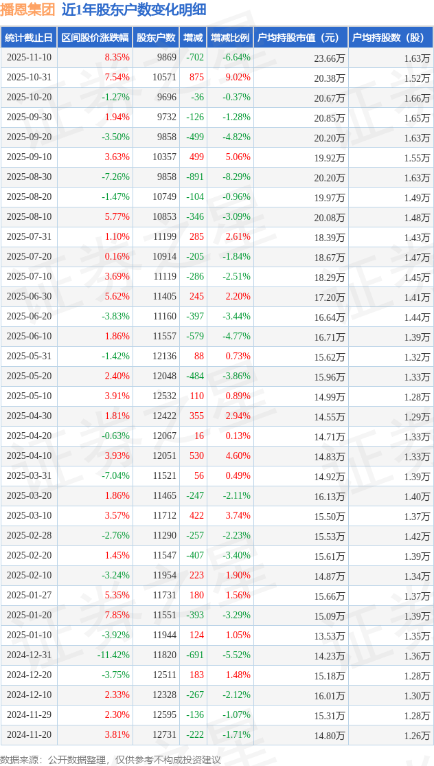 从股价来看,2025年10月31日至2025年11月10日,播恩集团区间涨幅为8.35%,在此期间股东户数减少702.0户,减幅为6.64%。