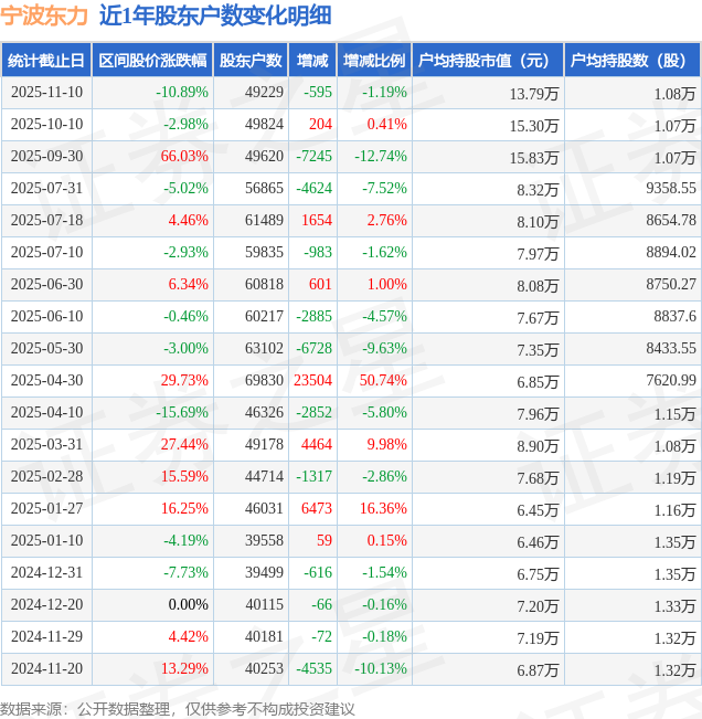 从股价来看,2025年10月10日至2025年11月10日,宁波东力区间跌幅为10.89%,在此期间股东户数减少595.0户,减幅为1.19%。
