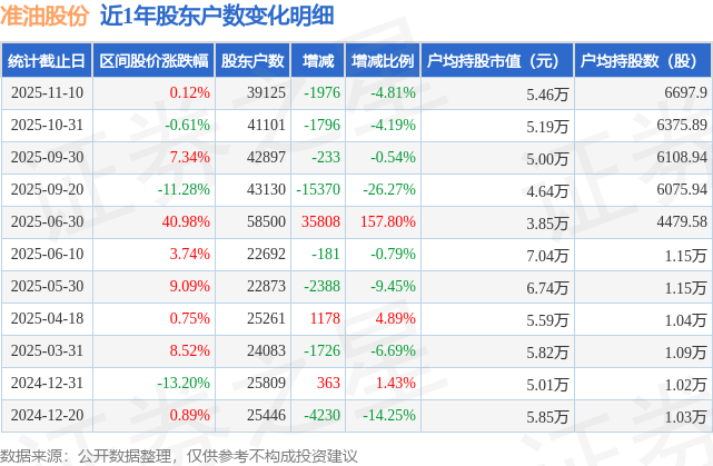 从股价来看,2025年10月31日至2025年11月10日,准油股份区间涨幅为0.12%,在此期间股东户数减少1976.0户,减幅为4.81%。