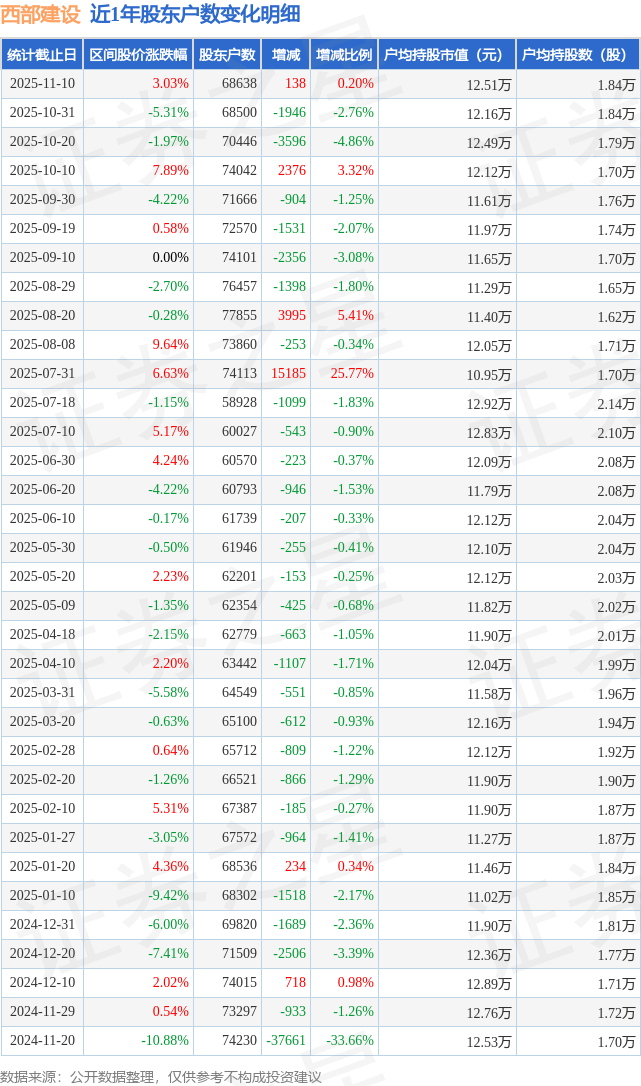 从股价来看,2025年10月31日至2025年11月10日,西部建设区间涨幅为3.03%,在此期间股东户数增加138.0户,增幅为0.2%。