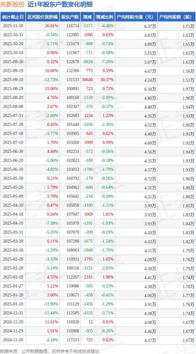 从股价来看,2025年10月31日至2025年11月10日,兆新股份区间涨幅为26.01%,在此期间股东户数减少5371.0户,减幅为4.4%。
