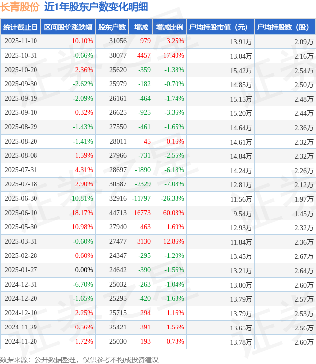 从股价来看,2025年10月31日至2025年11月10日,长青股份区间涨幅为10.1%,在此期间股东户数增加979.0户,增幅为3.25%。