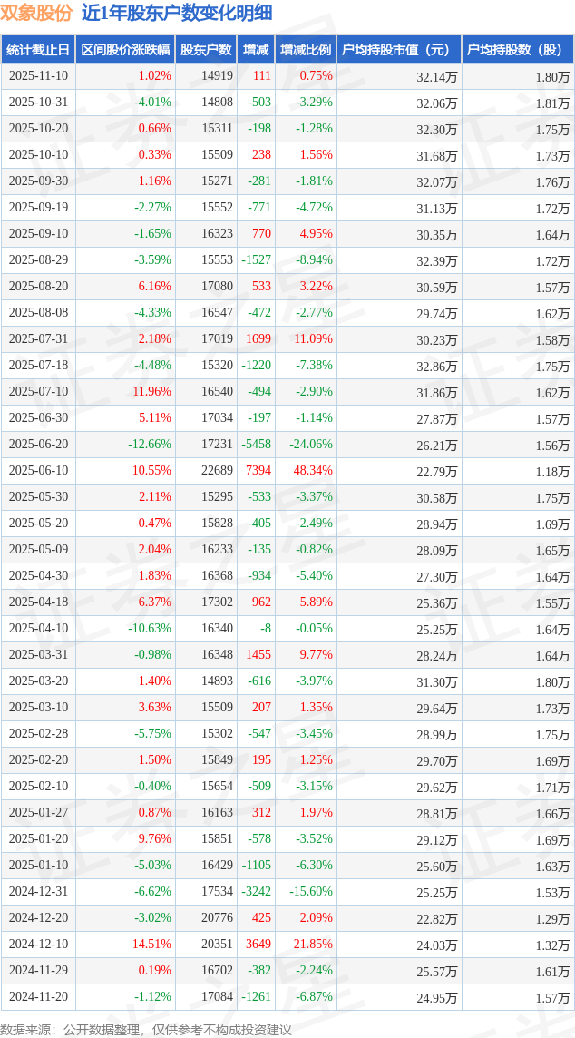 从股价来看,2025年10月31日至2025年11月10日,双象股份区间涨幅为1.02%,在此期间股东户数增加111.0户,增幅为0.75%。