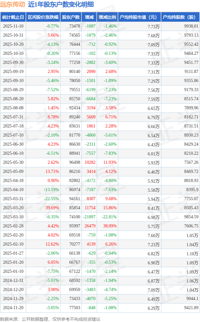 证券之星消息,近日远东传动披露,截至2025年11月10日公司股东户数为7.35万户,较10月31日减少1087.0户,减幅为1.46%。户均持股数量由上期的9793.0股增加至9938.0股,户均持股市值为7.73万元。