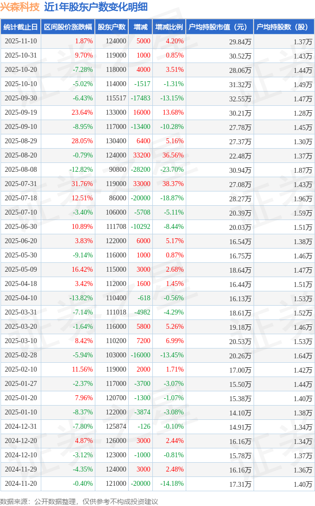 证券之星消息,近日兴森科技披露,截至2025年11月10日公司股东户数为12.4万户,较10月31日增加5000.0户,增幅为4.2%。户均持股数量由上期的1.43万股减少至1.37万股,户均持股市值为29.84万元。