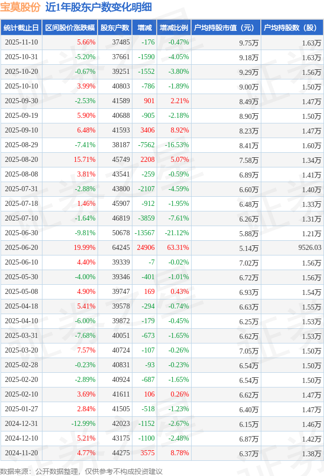 从股价来看,2025年10月31日至2025年11月10日,宝莫股份区间涨幅为5.66%,在此期间股东户数减少176.0户,减幅为0.47%。