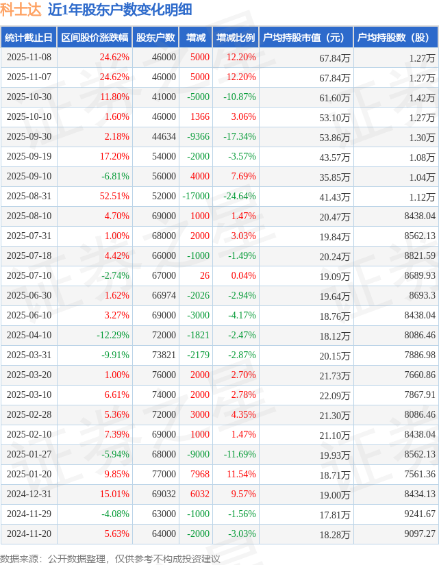 从股价来看,2025年10月31日至2025年11月8日,科士达区间涨幅为24.62%,在此期间股东户数增加5000.0户,增幅为12.2%。