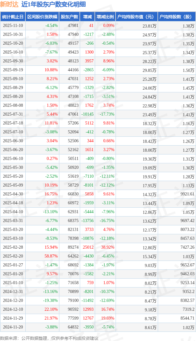 从股价来看,2025年10月31日至2025年11月10日,新时达区间跌幅为4.54%,在此期间股东户数增加41.0户,增幅为0.09%。