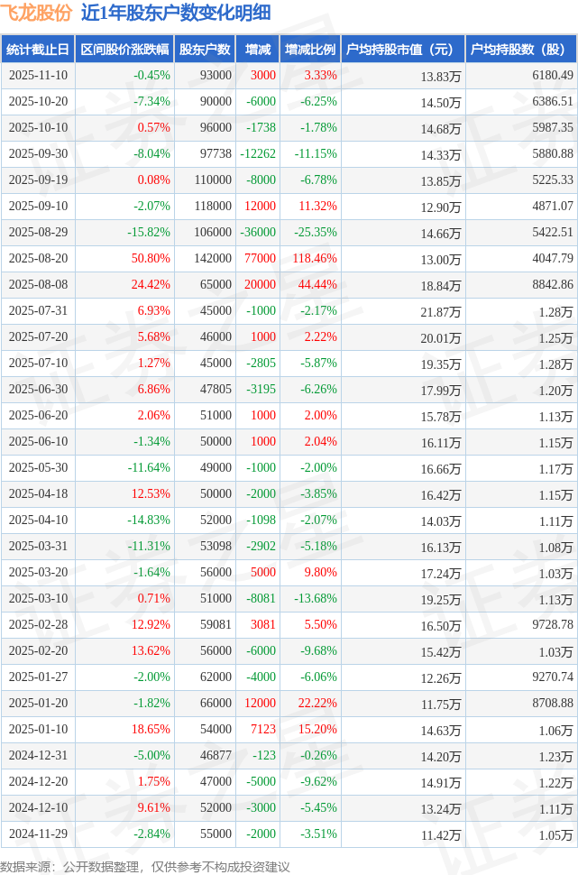 从股价来看,2025年10月31日至2025年11月10日,飞龙股份区间跌幅为0.45%,在此期间股东户数增加3000.0户,增幅为3.33%。