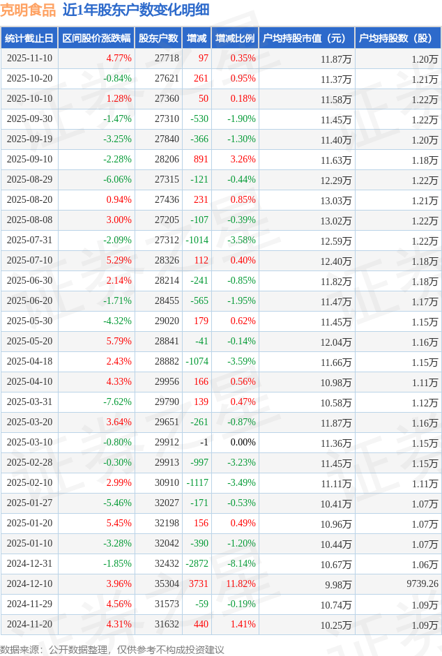 从股价来看,2025年10月20日至2025年11月10日,克明食品区间涨幅为4.77%,在此期间股东户数增加97.0户,增幅为0.35%。