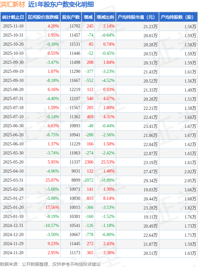 从股价来看,2025年10月31日至2025年11月10日,洪汇新材区间涨幅为4.2%,在此期间股东户数增加245.0户,增幅为2.14%。